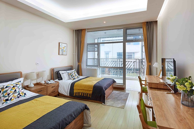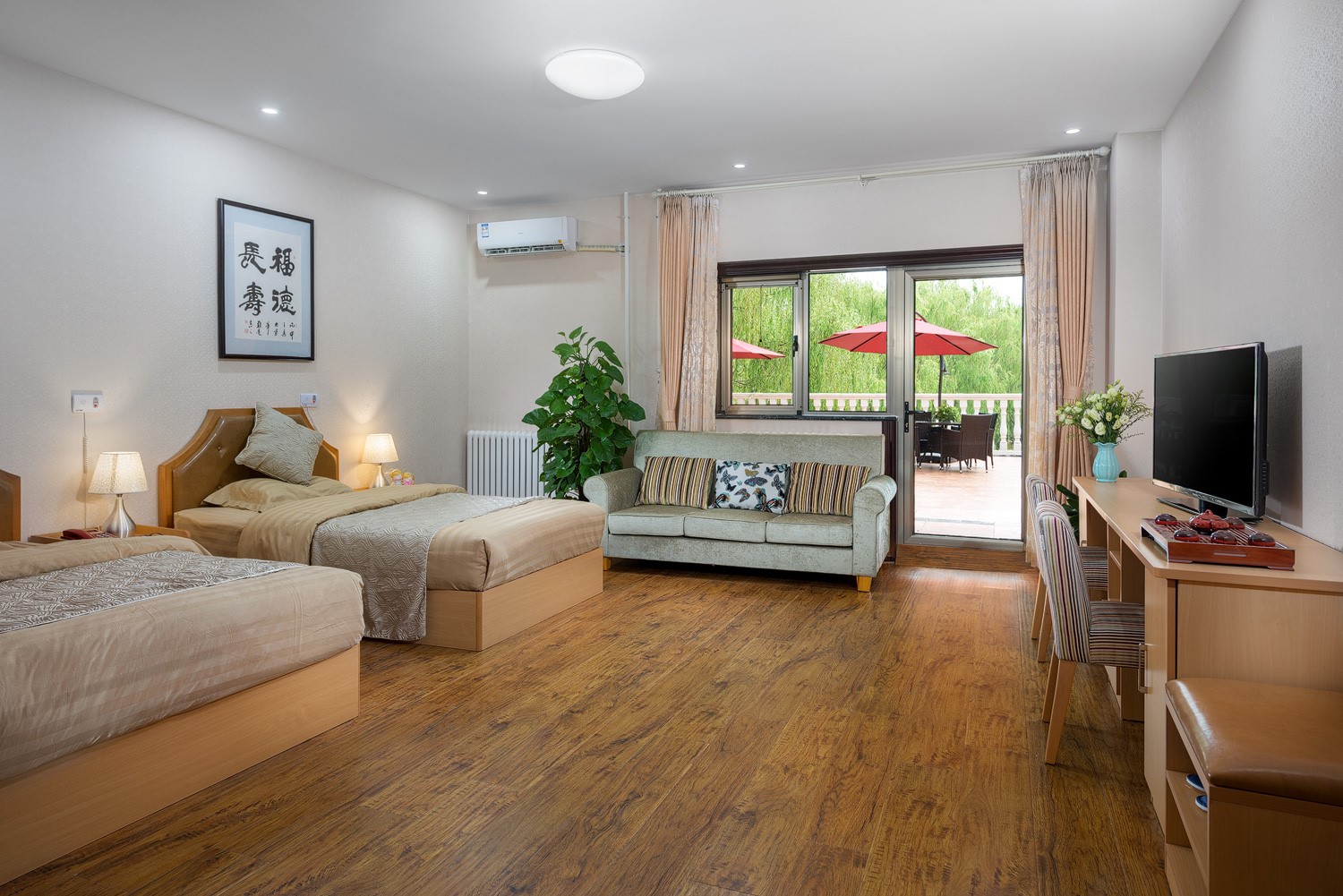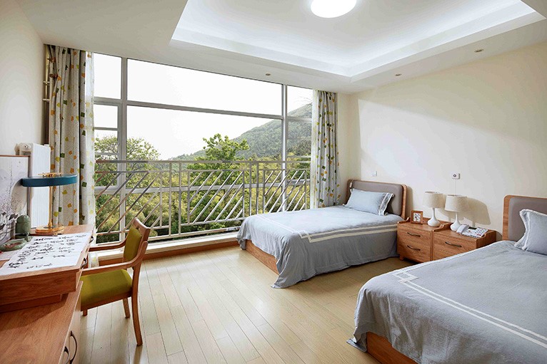 护理房间,明亮洁净。专用护理床具提供周全保护,便于护工照料和康复医疗。室内及走廊地面采用防滑处理,浴室和公共区域安装安全扶手,