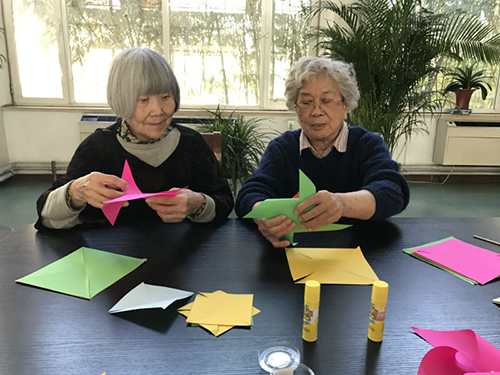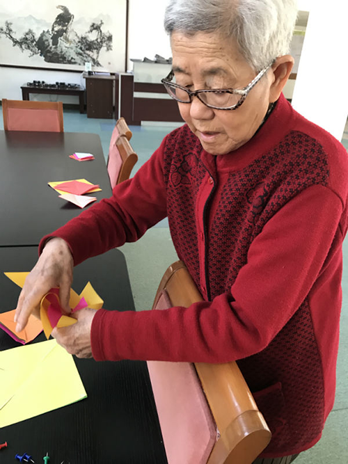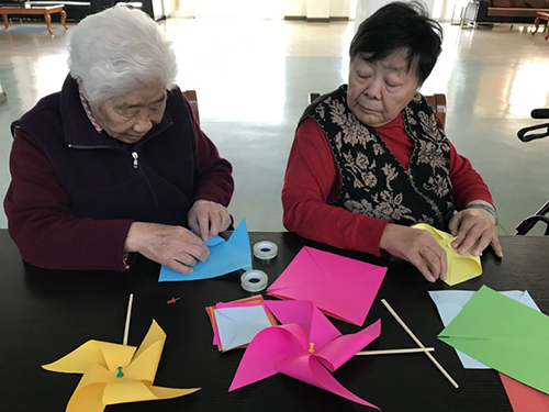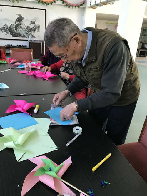 下午阳光依旧明媚,桌子上摆放着五颜六色的纸张以及做风车的工具,老人相约而至,伴随着儿时玩儿风车的美好回忆,开始动起手来做风车。