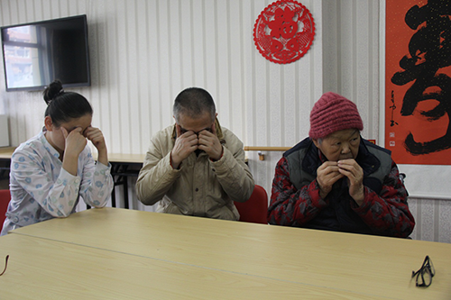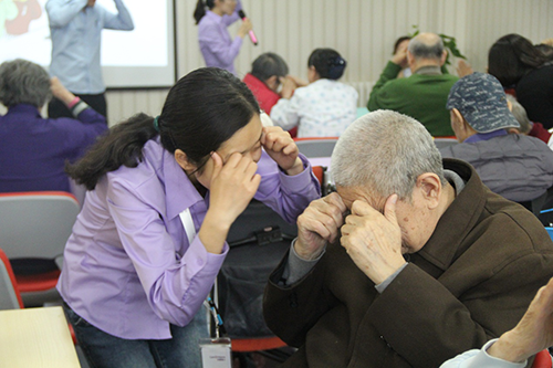 带领老人做操,按摩眼睛周围,动动手热热身。