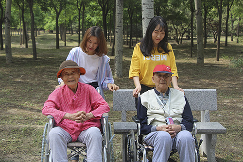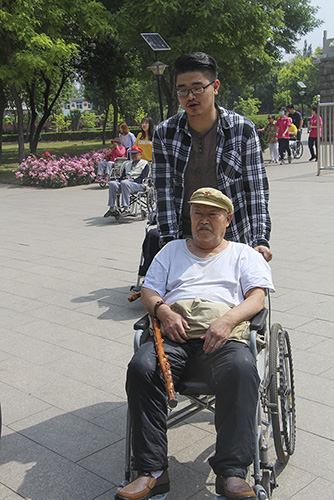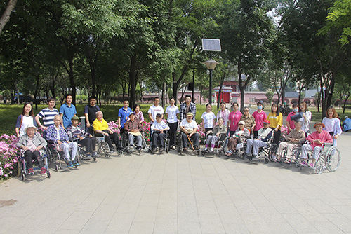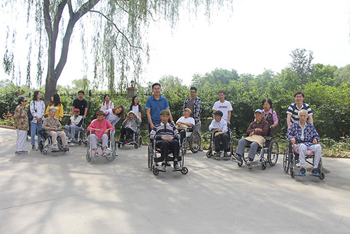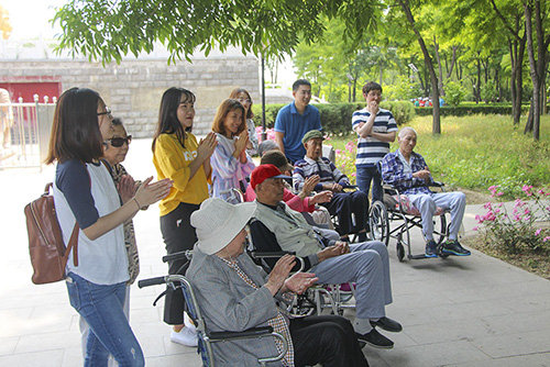 这次迈达斯的义工之行主要是带着入住公寓的护理型长者逛公园,散心怡情。因为护理型的长者大多身体、行动不便,大部门时间只能在公寓内行动。他们的到来帮助了爷爷奶奶门走出家门,欣赏大好风光。这下可把久居养老的爷爷奶奶高兴坏了,一大早都整装待发,迫不及待出发了。志愿者们推着爷爷奶奶,一边欣赏沿途的风景,一边聊着家常,看到这群年轻的孩子,爷爷奶奶们忍不住想起自己年轻时的模样。公寓的“老革命”和北京的帅气小伙聊起了那些年当兵的故事,从“老革命”的故事里我们能明白,和平友好的年代来之不易,幸福美好的生活要懂得珍惜。他的故事也让志愿者们肃然起敬,心生敬畏。