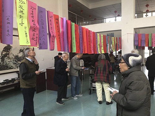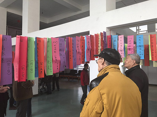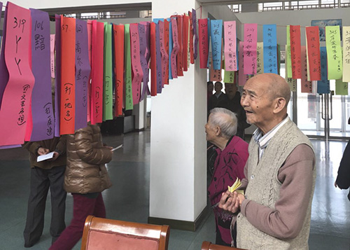 一条条五颜六色的彩纸上写着各式各样谜语,吸引了许多长者,激发了大家的积极性和参与热情。在每一个灯谜面前,长者们都认真思考,仔细揣摩,争相议论,都想解开每一个谜底,时而眉头紧锁,时而恍然大悟,时而笑追颜开。