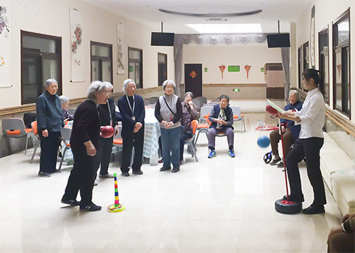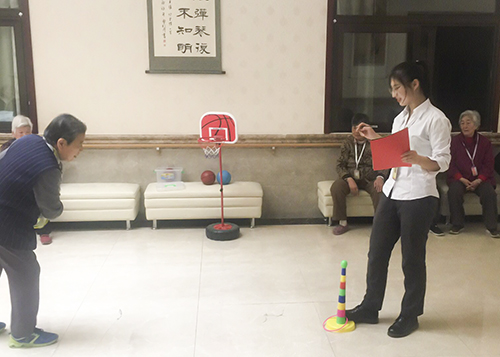 裁判上场首先请大家做了自我介绍,并向身边的人友好握手,表示友谊第一,参赛第二。接下来裁判向大家详细介绍了此次“耄耋运动会”的参赛流程及环节,本次运动会共设置了四项运动,“巧掷篮球”、“乐活套圈”、“水上乒乓”和“夹球进盆”。