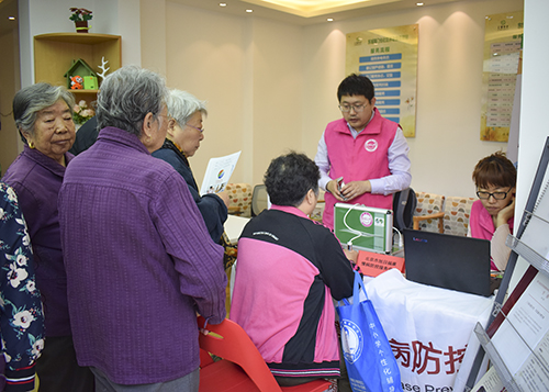 北京市旭日福康慢病防控服务中心的点位前聚集了很多居民,工作人员一一对他们进行了检查和测试,并向一位居民建议到:“您有点缺钙,要少食多餐,多吃点牛肉、虾皮,补充绿叶蔬菜。”