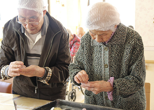 除夕当天的早上,我们的工作人员早早就准备好包饺子所需材料,分别送到了三楼和五楼大厅,桌子上也都提前铺好了保鲜膜,过一会,爷爷奶奶也都出来了,都挽起了袖子,戴好了口罩,准备和工作人员一起包饺子,他们一起分工合作,工作人员擀饺子皮,爷爷奶奶们包饺子,忙得不亦乐乎。