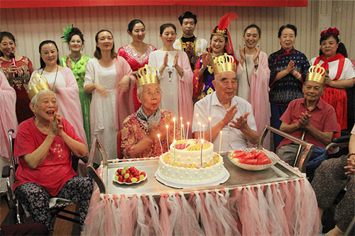 “祝你生日快乐,happy birthday to you……”在全体合唱《祝你生日快乐》歌曲的阵阵歌声中,寿星们许愿、吹蜡烛、切蛋糕、合影留念。