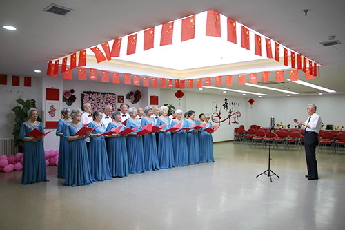 “百灵鸟,从蓝天飞过,我爱你,中国... ...”,《我爱你中国》,歌中饱含着对祖国的热爱,也唱出了这些歌者的心声,有的长者年轻时就是在这歌声中回到祖国,一颗颗拳拳赤子之心借歌声展现。bat365正版唯一官网北京朝来老年公寓合唱团由平均年龄为80岁的长者组成,合唱团有着认真负责的团长,严谨苛求的指挥与琴师,她们妆容焕发、精神抖擞、大方得体。
