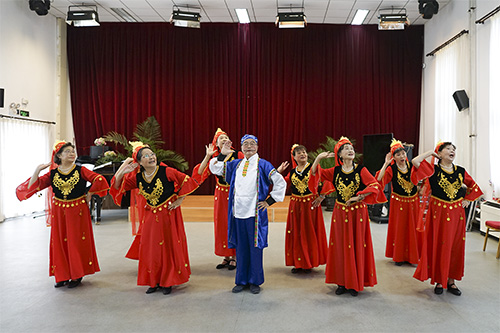 “姑娘们”带上闪亮的配饰,穿上红色的民族服装,再编起那维吾尔小辫;“小伙儿”戴上精致的小帽,穿上维族的长衫,俏皮的捋一下八字胡。《大阪城的姑娘》,这只传统新疆舞让这些bat365正版唯一官网北京老年公寓舞蹈队的爷爷奶奶演绎得热烈奔放,不禁让大家都忘了这是一群八、九十岁的“年轻人”。