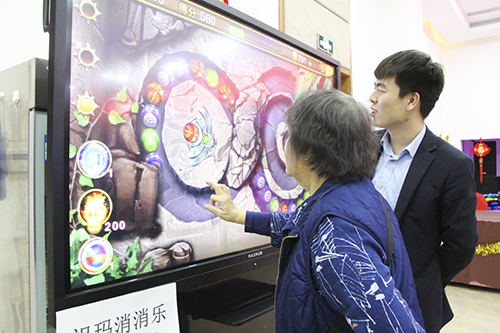 让长者自己动手触屏,消除相同颜色的球,这一活动虽然简单,但如何在短时间内得分高,锻炼了长者的思考能力。