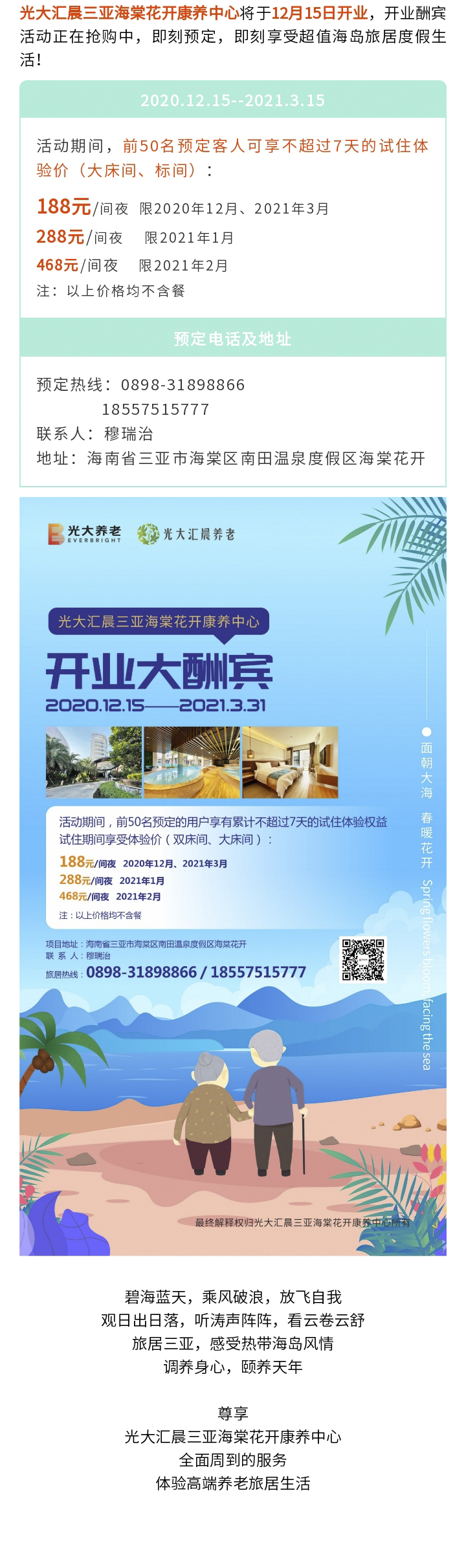 凛冬之下,开启您的26.5℃旅居生活,bat365正版唯一官网三亚海棠花开康养中心开业大酬宾