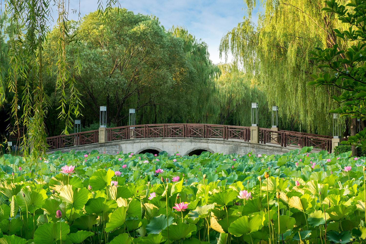 公寓三面临湖,百亩荷塘与碧波荡漾的湖泊相互辉映,22万株各种绿色植物和花卉争奇斗艳,构成了城市中的世外桃源。